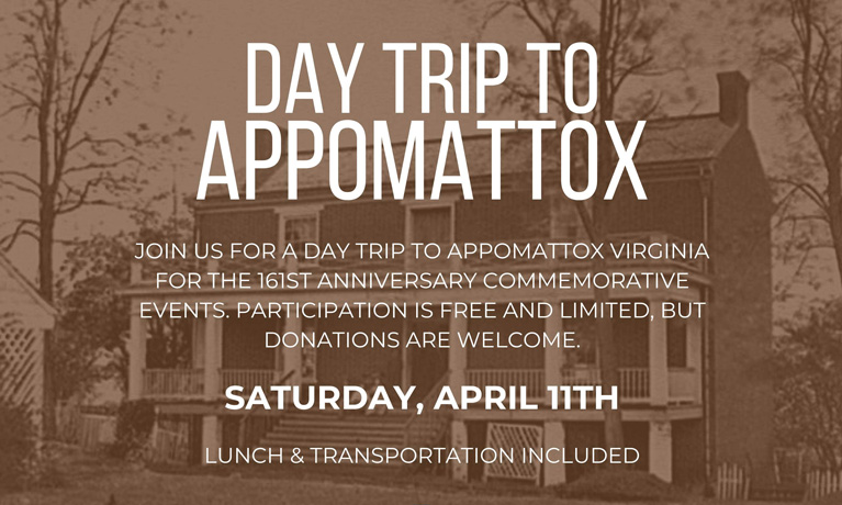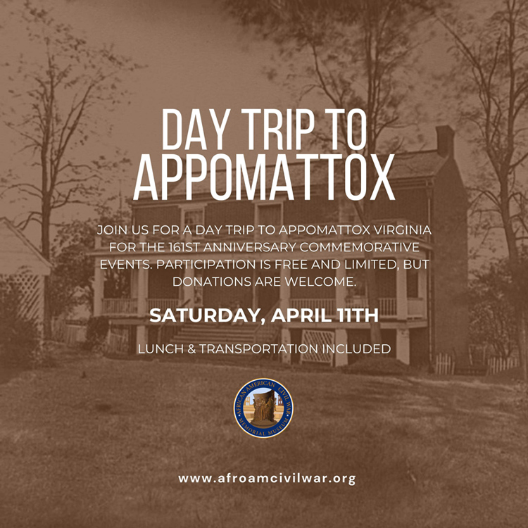 April 11, 2026 – 7am to 4pmJoin us for a day trip to Appomattox Virginia for the 161th Anniversary commemorative events. Participation is free and limited, but donations are welcome. Trip includes transportation and lunch. Questions and to RSVP? Contact Dawn Chitty at dawnchitty@afroamcivilwar.org.